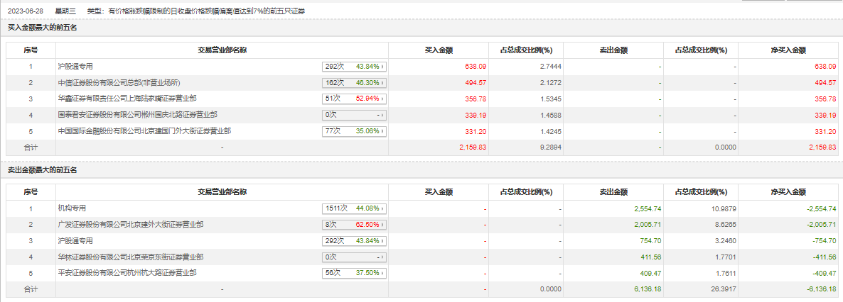 6月28日,德昌股份今日跌停,龙虎榜数据显示,上榜营业部席位全天成交8296.01万元,占当日总成交金额比例为35.68%。其中,买入金额为2159.83万元,卖出金额为6136.18万元,合计净卖出3976.34万元。