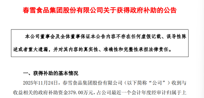 鲁股观察 | 春雪食品再获政府补助379万,年内累计516.53万