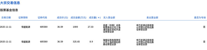 11月11日,恒盛能源大宗交易成交36.23万股,成交额1325.65万元,占当日总成交额的1.94%,成交价36.59元,较市场收盘价44.72元折价18.18%。