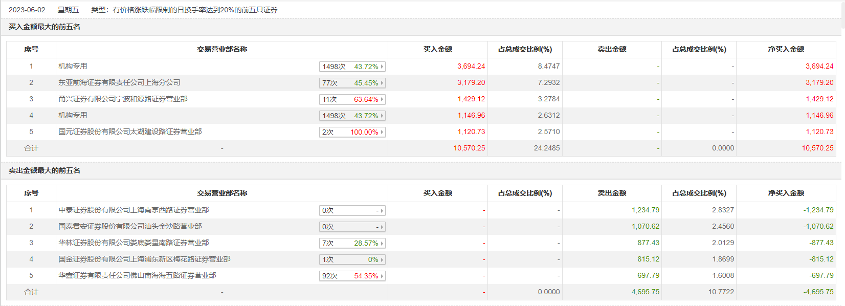 具体来看,机构合计净买入4841.2万元。此外,东亚前海证券上海分公司、甬兴证券有限公司宁波和源路证券营业部分别买入3179.20万元、1429.12万元;中泰证券上海南京西路证券营业部、国泰君安证券汕头金沙路营业部分别卖出1234.79万元、1070.62万元。