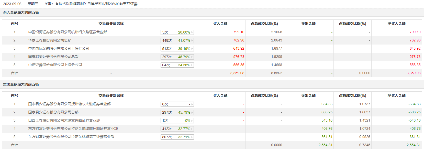 具体来看,中国银河证券杭州绍兴路证券营业部、华泰证券总部分别买入799.10万元、782.98万元;国泰君安证券抚州赣东大道证券营业部、国泰君安证券总部分别卖出634.83万元、608.25万元。