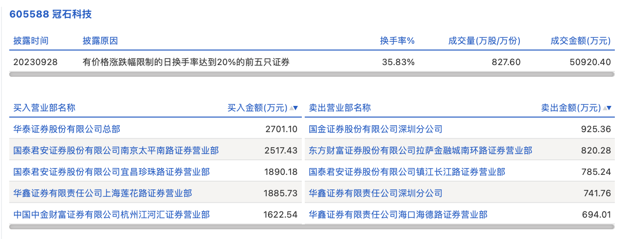 9月28日,冠石科技今日涨停,全天换手率达35.83%,振幅达11.22%。龙虎榜数据显示,营业部席位合计净买入6650.32万元。其中,华泰证券总部、作手新一(国泰君安证券南京太平南路证券营业部)分别买入2701.10万元、2517.43万元;国金证券深圳分公司、东方财富证券拉萨金融城南环路证券营业部分别卖出925.36万元、820.28万元。