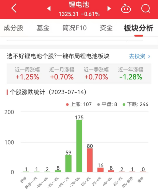 中国经济网北京7月14日讯今日,锂电池板块整体涨幅-0.61%,其中107只股票上涨,8只股票平盘,246只股票下跌。