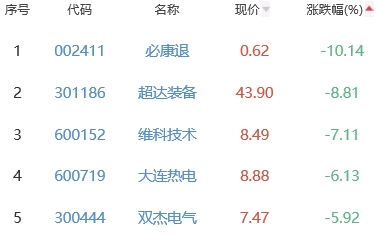 必康退、超达装备、维科技术、大连热电、双杰电气位列涨幅榜后五位,涨幅分别为-10.14%、-8.81%、-7.11%、-6.13%、-5.92%。