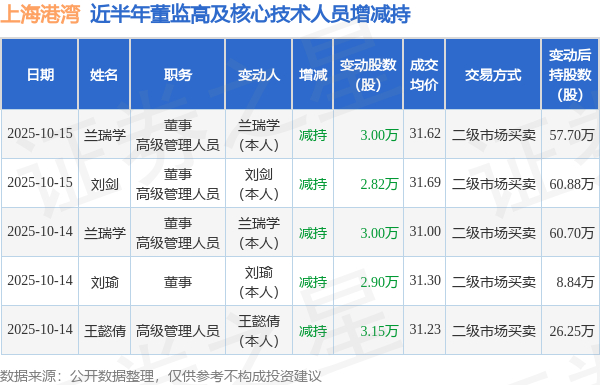 上海港湾近半年内的董监高及核心技术人员增减持详情如下: