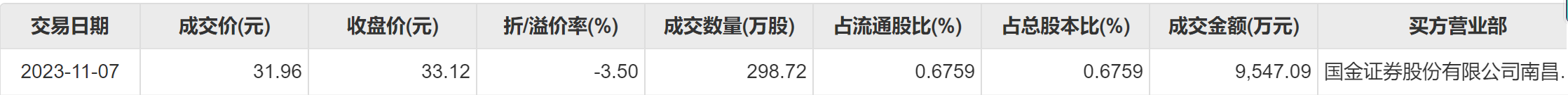 今日大宗交易成交298.72万股,成交额9547.09万元,占当日总成交额的49.66%,成交价31.96元,较市场收盘价折价3.5%。