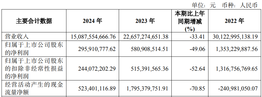 2024年,公司实现营业收入150.88亿元,同比下降33.41%;归属于上市公司股东的净利润2.96亿元,同比下降49.06%;归属于母公司所有者的扣除非经常性损益的净利润2.44亿元,同比下降52.64%;经营活动产生的现金流量净额为5.23亿元,上年同期为17.95亿元。