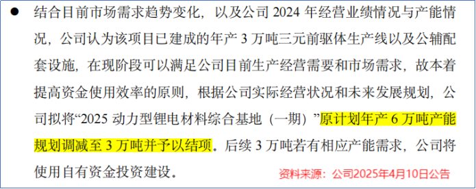 根据公告,公司将原计划6万吨的三元前驱体项目缩减至3万吨,理由是“当前市场供给充足,已建成的年产3万吨产能能够满足现阶段需求”。