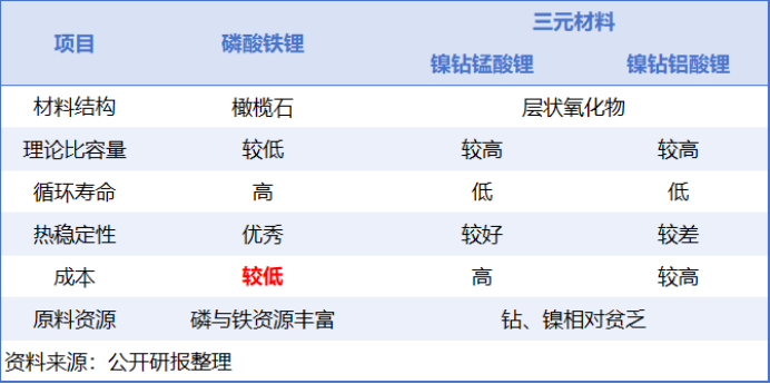 由于磷酸铁锂材料成本较低、寿命高、稳定性好,国内车企为控制成本会优先选择搭载磷酸铁锂电池,导致三元材料在动力电池领域的市场份额持续被挤压。