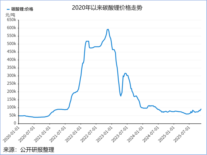 2022年以来,碳酸锂的价格从59万元/吨降低到2025年11月的8万元/吨。