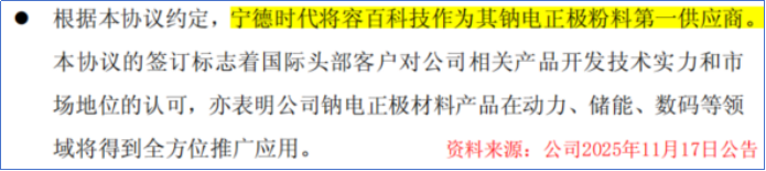 11月16日,锂电正极材料头部企业容百科技发布公告:公司与宁德时代近日签订了《合作协议》,容百科技将作为宁德时代钠电正极粉料第一供应商。