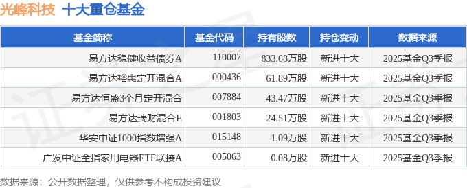 持有光峰科技最多的基金为易方达稳健收益债券A,目前规模为158.16亿元,最新净值1.4334(10月31日),较上一交易日上涨0.15%,近一年上涨6.88%。该基金现任基金经理为胡剑。