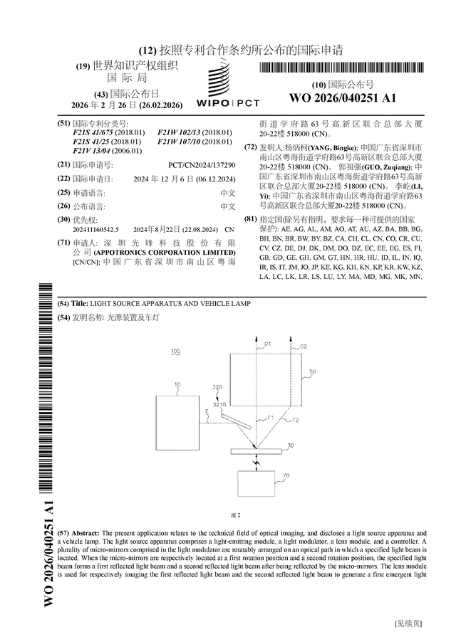 证券之星消息,根据企查查数据显示光峰科技(688007)公布了一项国际专利申请,专利名为“光源装置及车灯”,专利申请号为PCT/CN2024/137290,国际公布日为2026年2月26日。