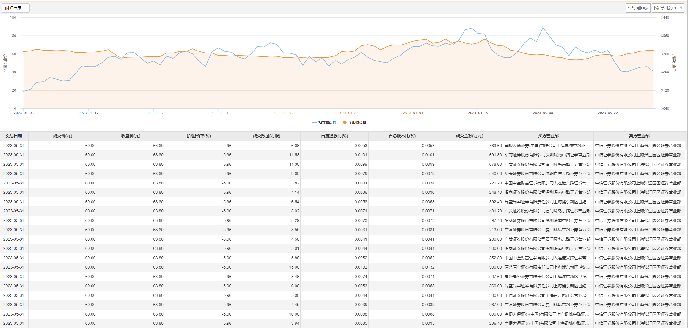 5月31日大宗交易成交140.67万股,成交额8440.2万元,占当日总成交额的8.62%,成交价60元,较市场收盘价63.8元折价5.96%。