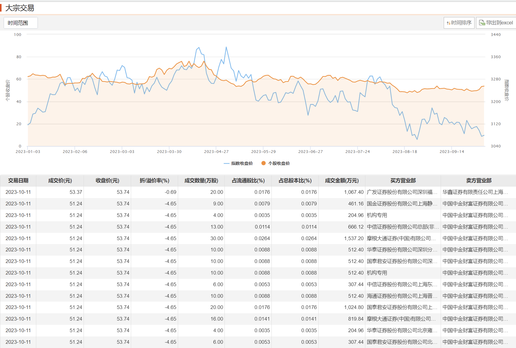 10月11日,澜起科技今日大宗交易成交168万股,成交额8650.92万元,占当日总成交额的11.76%,成交均价51.49元,较市场收盘价折价4.19%,其中最高成交价53.37元,最低成交价51.24元。