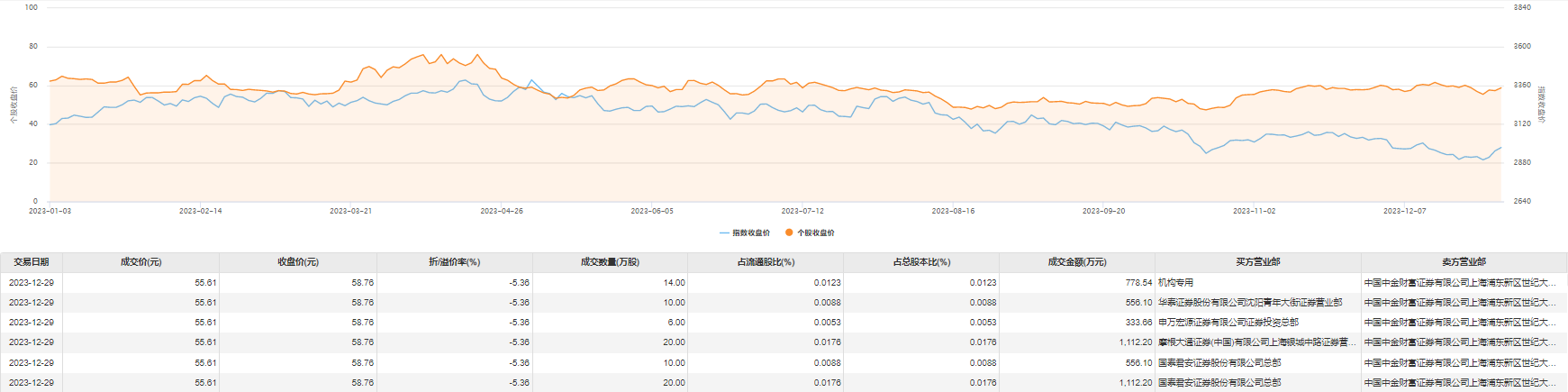 今日大宗交易成交80万股,成交额4448.8万元,占当日总成交额的6.66%,成交价55.61元,较市场收盘价折价5.36%。