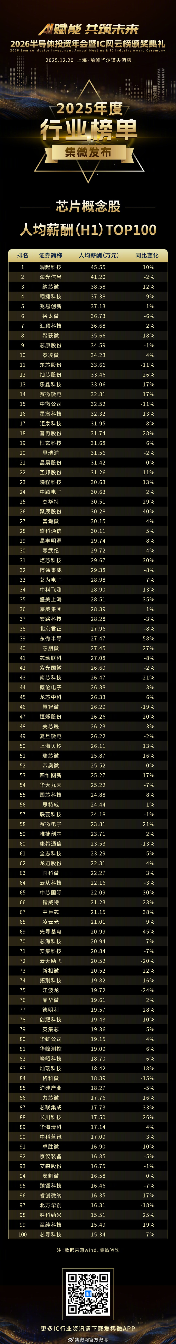 此为“芯片概念股”系列榜单之《中国芯·芯片概念股——人均薪酬(H1)TOP100》。