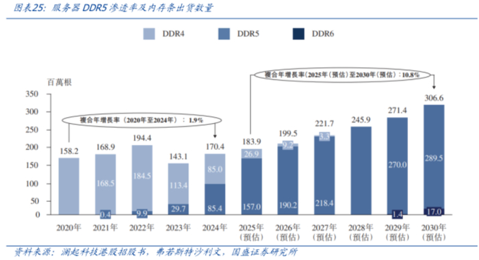 AI训练场景下,海量数据集的反复吞吐对内存带宽提出更高要求,DDR5渗透率快速提升。根据弗若斯特沙利文的统计,服务器DDR5的渗透率预计将从2024年的50.1%跃升至2025年的85.3%。
