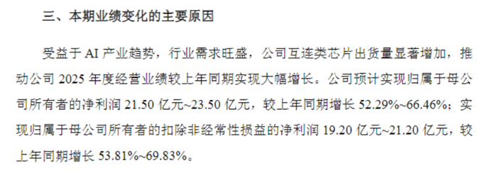公司在业绩预告中同样指出,受益于AI产业趋势带来的旺盛需求,互联类芯片出货量实现显著增长。