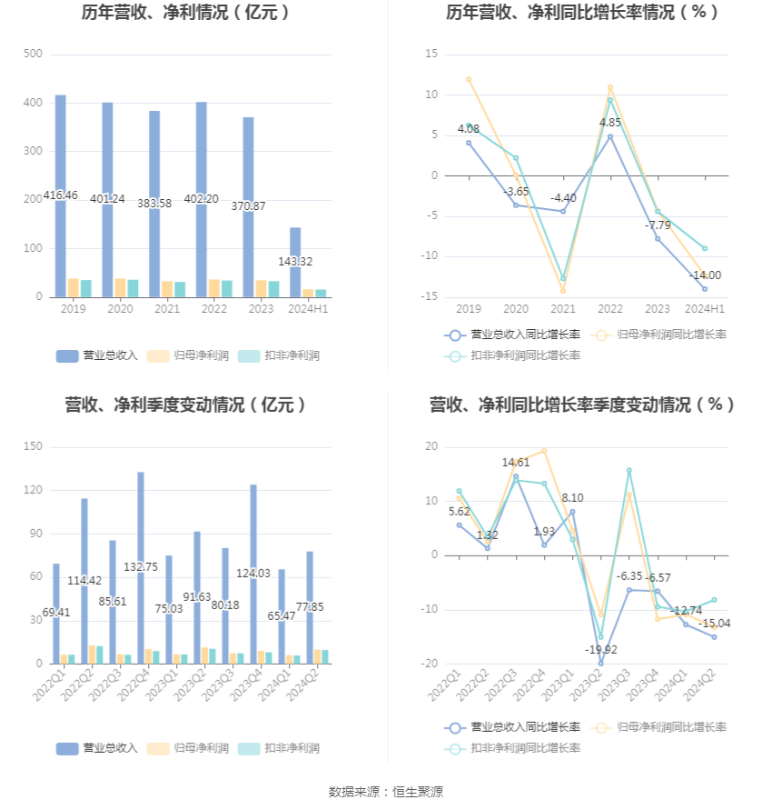 根据半年报,公司第二季度实现营业总收入77.85亿元,同比下降15.04%,环比增长18.90%;归母净利润9.95亿元,同比下降13.20%,环比增长64.53%;扣非净利润9.66亿元,同比下降8.17%,环比增长62.51%。