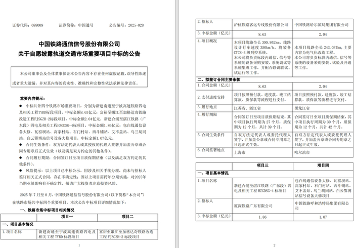 2025年9月26日,中国通号发布公告称近期在铁路市场中标的四个重要项目,总金额约13.6亿元。