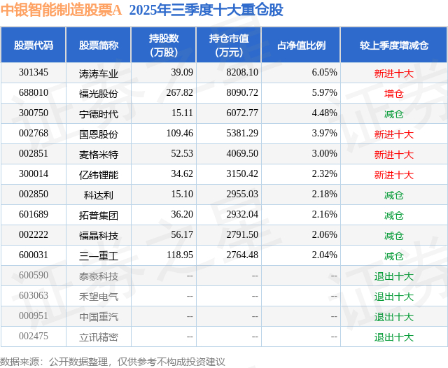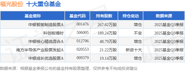 根据2025基金Q3季报公募基金重仓股数据,重仓该股的公募基金共5家,其中持有数量最多的公募基金为中银基金的中银智能制造股票A。中银智能制造股票A目前规模为12.03亿元,最新净值2.617(10月29日),较上一交易日上涨1.32%,近一年上涨49.29%。该公募基金现任基金经理为周斌。周斌在任的基金产品包括:中银成长优选股票A,管理时间为2022年3月30日至今,期间收益率为18.45%;中银核心精选混合A,管理时间为2023年12月4日至今,期间收益率为42.01%;