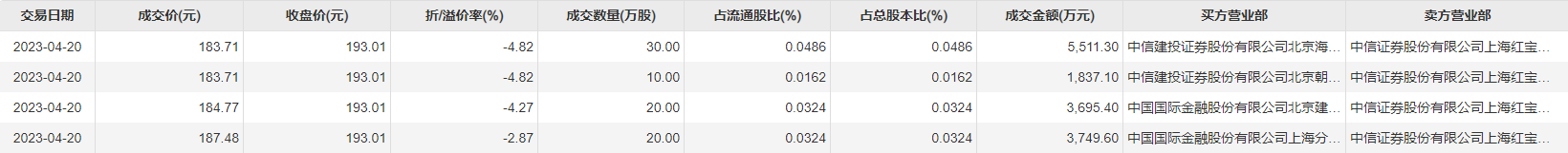中微公司4月20日大宗交易成交80万股,成交额1.48亿元,占当日总成交额的3.73%,成交均价184.92元,较市场收盘价193.01元折价4.19%,其中最高成交价187.48元,最低成交价183.71元。