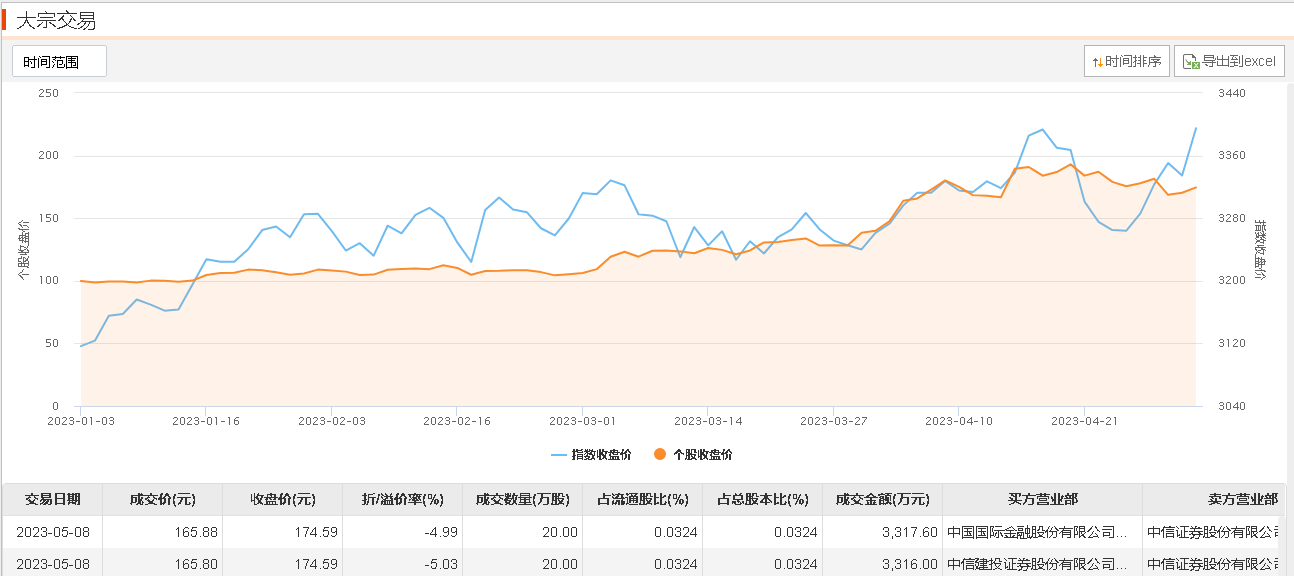 5月8日,中微公司大宗交易成交40万股,成交额6633.6万元,占当日总成交额的3.48%,成交均价165.84元,较市场收盘价174.59元折价5.01%,其中最高成交价165.88元,最低成交价165.8元。