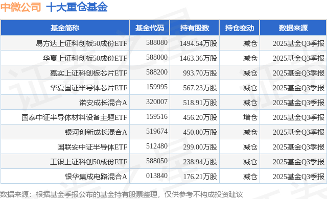 根据2025基金Q3季报公募基金重仓股数据,重仓该股的公募基金共364家,其中持有数量最多的公募基金为易方达基金的易方达上证科创板50成份ETF。易方达上证科创板50成份ETF目前规模为767.61亿元,最新净值1.3683(11月19日),较上一交易日下跌0.96%,近一年上涨35.28%。该公募基金现任基金经理为林伟斌 成曦。林伟斌在任的基金产品包括:易方达中证红利ETF,管理时间为2019年11月26日至今,期间收益率为81.95%;易方达中证红利ETF联接发起式A,管理时间为2020年7月8日至今,期间收益率为55.8%;易方达上证科创50联接A,管理时间为2021年3月1日至今,期间收益率为4.57%。成曦在任的基金产品包括:易方达创业板ETF联接A,管理时间为2016年5月7日至今,期间收益率为46.97%;易方达深证100ETF,管理时间为2016年5月7日至今,期间收益率为80.29%;易方达创业板ETF,管理时间为2016年5月7日至今,期间收益率为50.22%;