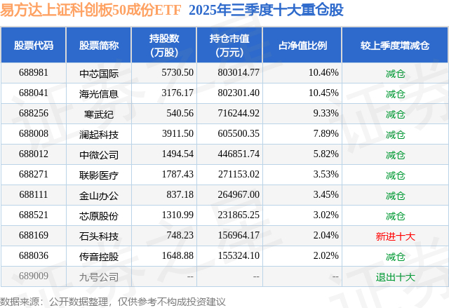 易方达上证科创板50成份ETF的前十大重仓股如下: