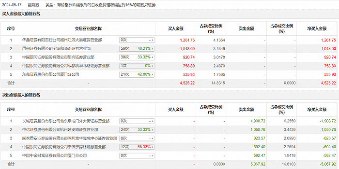 交控科技5月17日涨停,龙虎榜数据显示,上榜营业部席位全天成交9593.14万元,占当日总成交金额比例为31.44%。其中,买入金额为4525.23万元,卖出金额为5067.91万元,合计净卖出542.69万元。