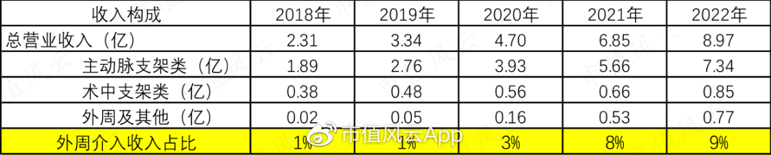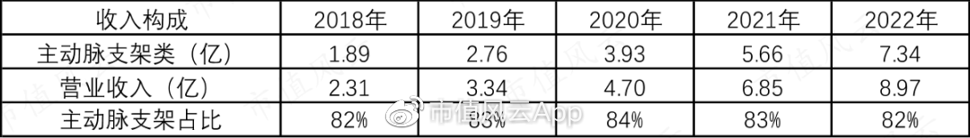 核心产品主动脉支架每年都有增长,从2018年的1.89亿增长到了2022的7.34亿,目前仍是贡献80%收入以上的拳头产品,2021年年报显示国内市占率为28%。