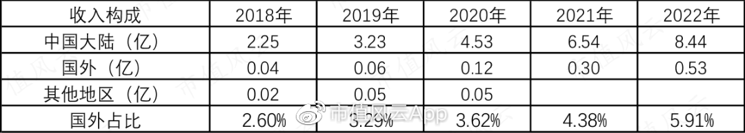 外周及其他收入从2018年的0.02亿增长到2022年的0.77亿,比例从1%提高到了9%。