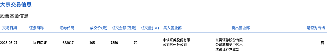 绿的谐波今日大宗交易折价成交70万股,成交额7350万元