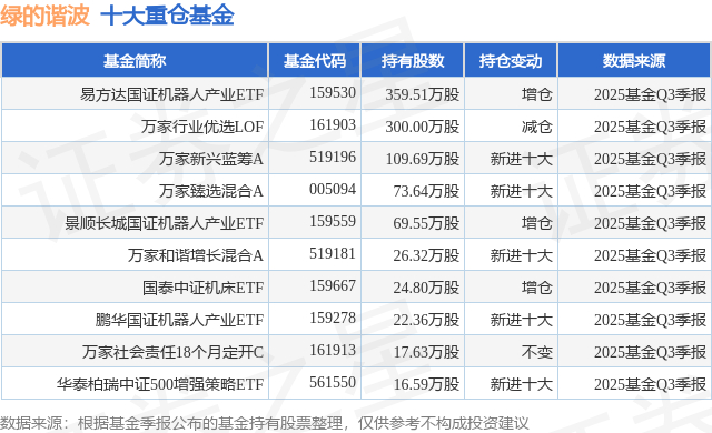 根据2025基金Q3季报公募基金重仓股数据,重仓该股的公募基金共29家,其中持有数量最多的公募基金为易方达基金的易方达国证机器人产业ETF。易方达国证机器人产业ETF目前规模为133.15亿元,最新净值1.5253(12月29日),较上一交易日上涨1.29%,近一年上涨26.93%。该公募基金现任基金经理为李栩 李树建。李栩在任的基金产品包括:易方达中证港股通互联网ETF,管理时间为2023年5月31日至今,期间收益率为40.07%;易方达中证2000ETF,管理时间为2023年9月13日至今,期间收益率为56.63%;易方达中证生物科技主题ETF发起式联接A,管理时间为2023年9月19日至今,期间收益率为-2.94%;易方达国证信息技术创新主题ETF,管理时间为2023年9月20日至今,期间收益率为57.01%。李树建在任的基金产品包括:易方达创业板中盘200ETF,管理时间为2023年12月15日至今,期间收益率为46.5%;易方达上证科创板成长ETF联接发起式A,管理时间为2024年1月4日至今,期间收益率为116.36%;易方达信创ETF联接A,管理时间为2024年1月5日至今,期间收益率为78.5%;易方达机器人ETF联接A,管理时间为2024年5月21日至今,期间收益率为46.31%。