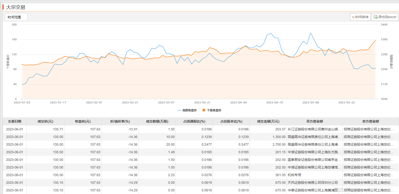 乐鑫科技6月1日大宗交易成交51.69万股,成交额6982.78万元,占当日总成交额的10.46%,成交均价135.09元,较市场收盘价157.63元折价14.3%,其中最高成交价135.71元,最低成交价135元。