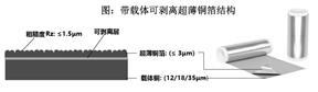 带载体可剥离超薄铜箔:主要特点为厚度超薄、表面轮廓极低,铜层厚度1.5-6μm,铜层粗糙度0.5-2.0μm,剥离强度≥6N/cm,拉伸强度400N/mm2,延伸率≥5%;