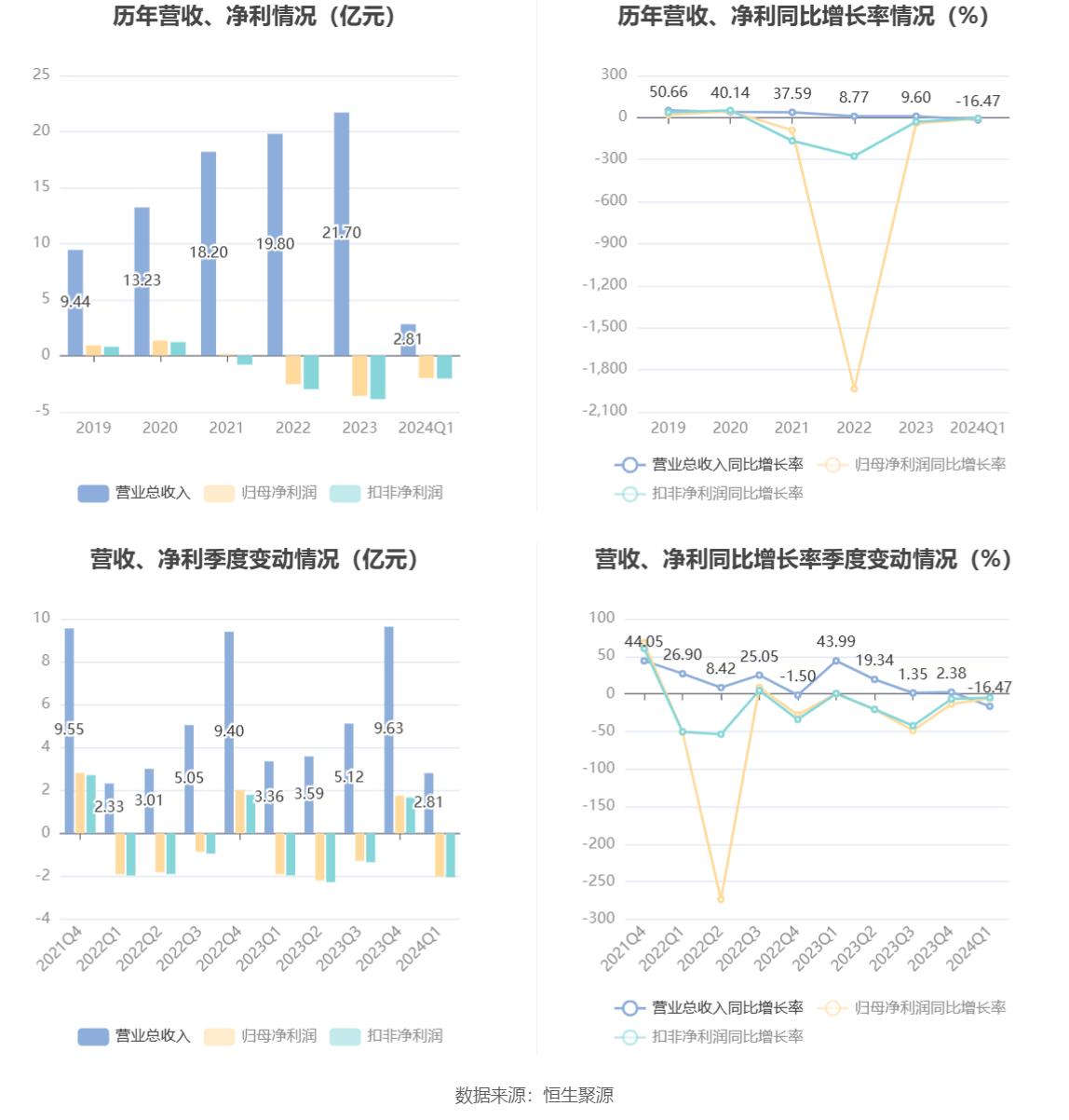 2024年第一季度,公司毛利率为49.90%,同比下降6.50个百分点;净利率为-72.52%,较上年同期下降15.14个百分点。
