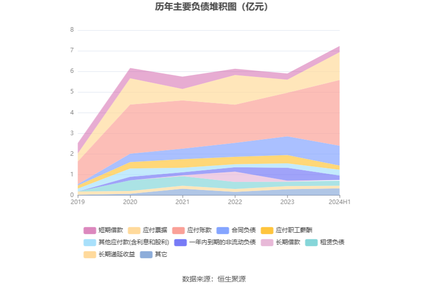 负债重大变化方面,截至2024年上半年末,公司应付账款较上年末增加51.02%,占公司总资产比重上升3.58个百分点,主要系应;应付票据较上年末增加112.98%,占公司总资产比重上升2.53个百分点;一年内到期的非流动负债较上年末减少67.42%,占公司总资产比重下降1.72个百分点;应付职工薪酬较上年末减少49.32%,占公司总资产比重下降0.82个百分点。