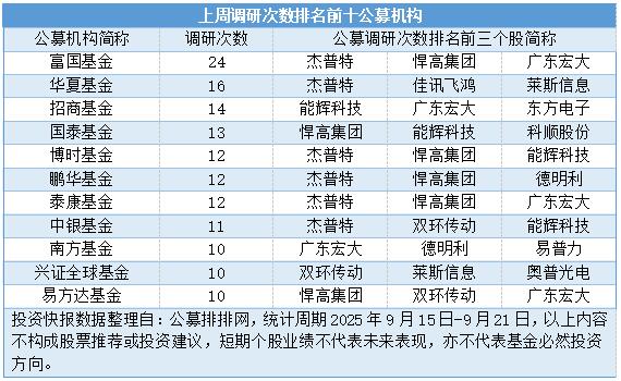投资快报记者从公募排排网数据看到,上周(2025年9月15日-9月21日)共有124家公募机构参与到A股调研活动中,覆盖到23个申万一级行业中的141只个股,合计调研次数达582次。