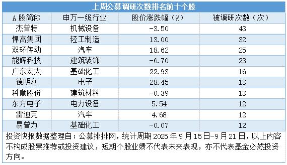 机械设备行业个股杰普特最受公募调研青睐,上周吸引到博时基金、富国基金、华夏基金等在内的近三成公募机构扎堆调研达43次。