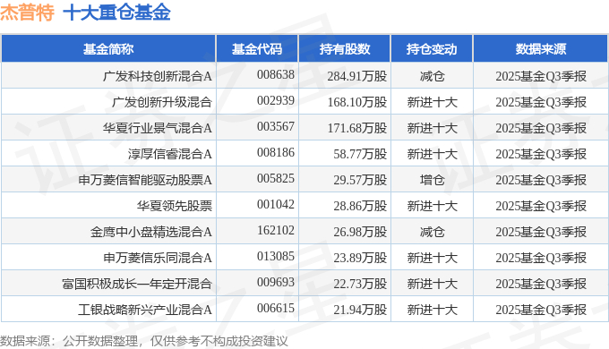 持有杰普特最多的基金为广发科技创新混合A,目前规模为31.41亿元,最新净值2.3912(10月31日),较上一交易日上涨0.0%,近一年上涨45.45%。该基金现任基金经理为吴远怡。