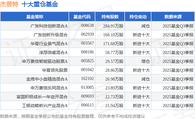 根据2025基金Q3季报公募基金重仓股数据,重仓该股的公募基金共31家,其中持有数量最多的公募基金为广发基金的广发科技创新混合A。广发科技创新混合A目前规模为31.41亿元,最新净值2.2322(11月20日),较上一交易日下跌2.43%,近一年上涨35.38%。该公募基金现任基金经理为吴远怡。吴远怡在任的基金产品包括:广发创新升级混合,管理时间为2020年9月30日至今,期间收益率为-20.19%;广发北交所精选两年定开混合A,管理时间为2021年11月23日至今,期间收益率为76.62%;广发价值核心混合A,管理时间为2022年11月1日至今,期间收益率为88.45%。