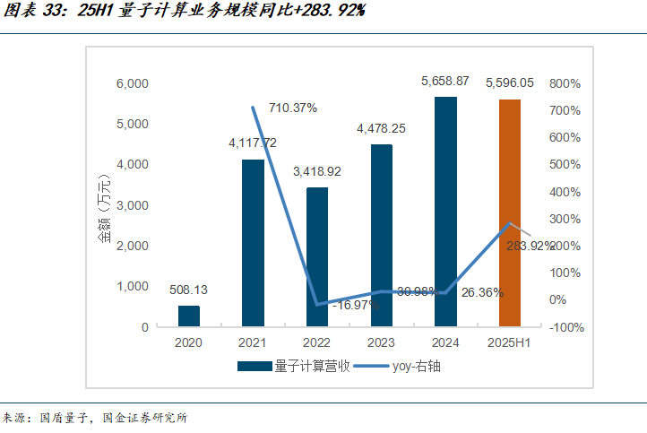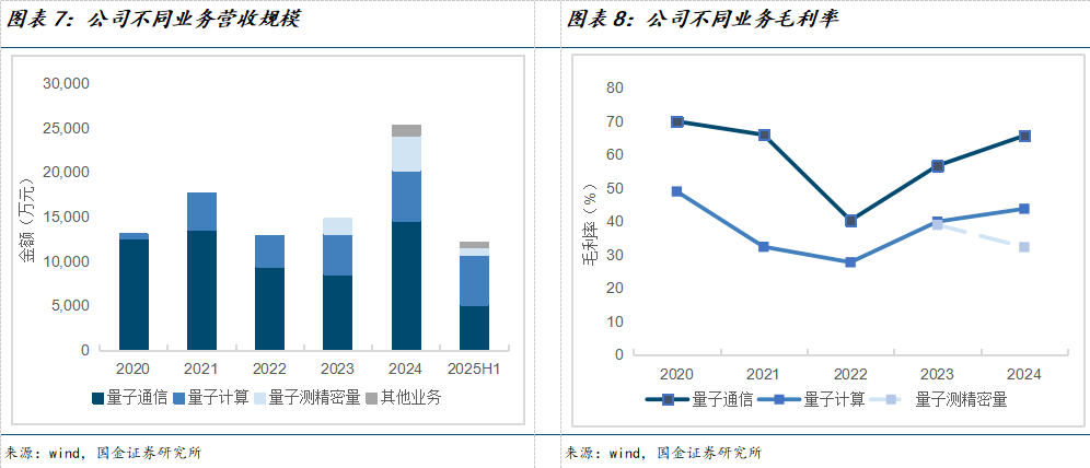 量子计算与量子通信是公司两大核心业务板块。分产品看,公司2025年上半年量子计算、量子通信、量子精密测量业务营收分别为5596.05/5173.77/856.51万元、同比增长283.92%/28.10%/13.75%。其中,量子计算业务的爆发式增长主要得益于两大因素:一是量子计算整机顺利通过验收,二是量子计算云平台在业务验证、生态构建及科普推广等方面的成效逐步显现。