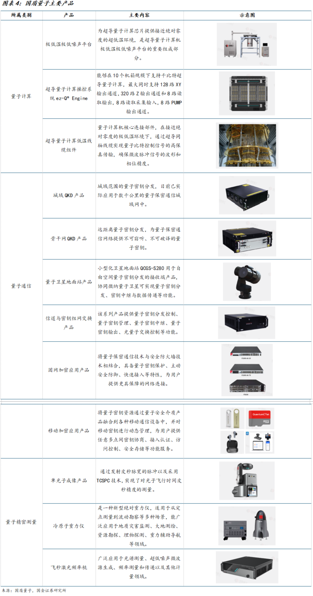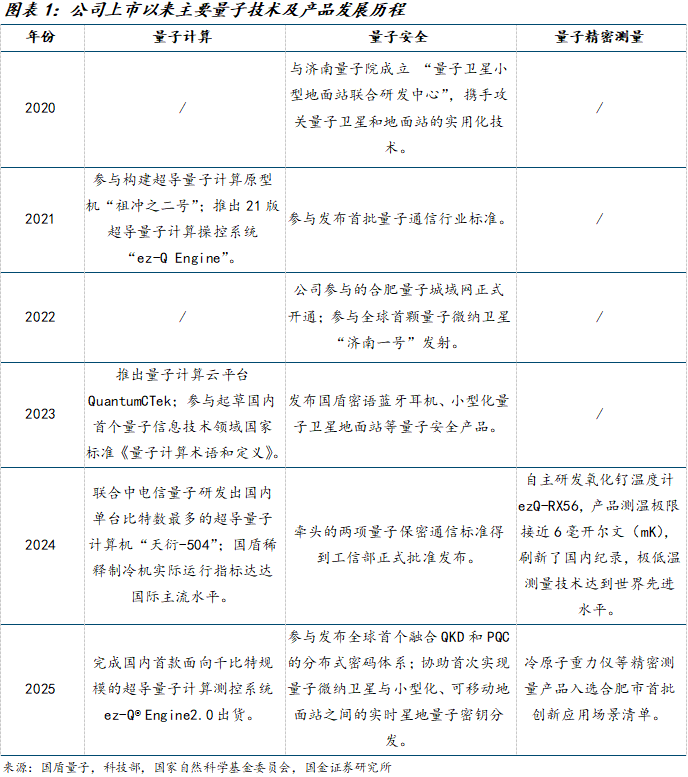 公司全面布局量子计算、量子安全、量子精密测量领域,逐步成长为量子技术领域综合性企业。公司成立于2009年,技术源自中国科学技术大学,主要从事量子通信、量子计算、量子精密测量产品的研发、生产、销售并提供相关技术服务。公司于2020年完成上市,成为国内首家专注于量子科技领域的上市公司,也是全球少有的业务范围覆盖量子通信、量子计算、量子精密测量三大领域的上市公司。在量子通信领域,国盾量子是全球领先的量子通信设备供应商,为国家级“京沪干线”量子通信骨干网提供核心设备,同时推出面向个人用户的量子安全通信终端产品,其量子密钥分发设备在政务、金融等重点领域已实现规模化应用;在量子计算领域,公司深度参与“祖冲之号”系列超导量子计算机的研发工作,具备从核心部件到整机系统的全栈研发能力,同时不断完善国产化自主可控产业链布局,先后推出操控系统、稀释制冷机等核心组件,并提供量子计算云平台等服务;在量子精密测量领域,公司研发的冷原子重力仪、单光子探测器等设备组件已在部分领域实现示范应用,逐步成为公司新的业务增长点。