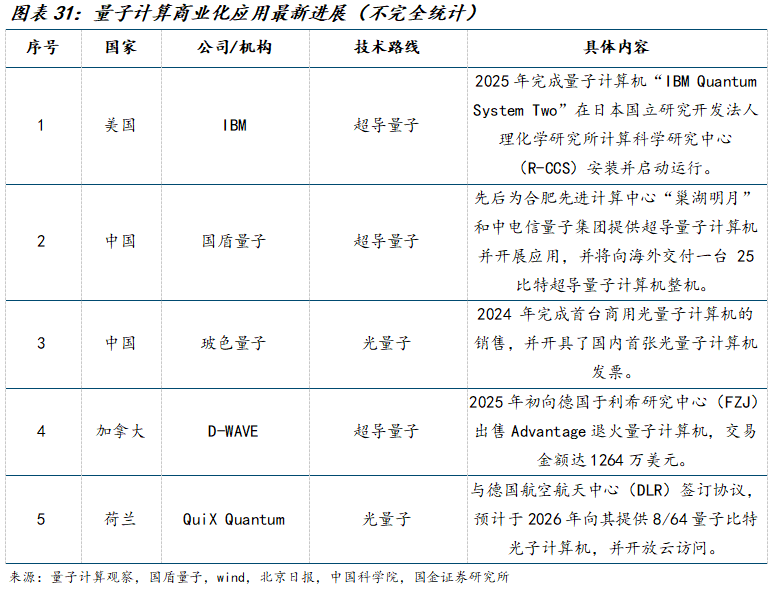 超导和光量子技术商业化前景最为明朗,头部企业开启商业化应用实践。目前,量子计算呈现出多种技术路线并行发展的多元化格局,主要技术路线包括超导、离子阱、光量子、中性原子、硅半导体等。不同技术路线在量子比特的实现方式、性能特点、应用场景等方面各有优劣。其中,超导和光量子技术路线有望凭借其在量子比特数量和量子纠错能力方面的相对领先地位,率先展现出商业化应用潜力。目前,量子计算技术尚处发展初期,硬件性能未达实用化门槛且应用场景适配成本较高,多数企业仍停留在技术研发或小范围试点阶段,能将量子计算技术转化为成熟商业产品并实现规模化营收的案例屈指可数,但仍有部分企业在特定应用场景中取得了显著进展。未来,随着产业链生态的完善、量子硬件性能提升以及应用成本的降低,量子计算或将在更多关键领域释放巨大潜力。