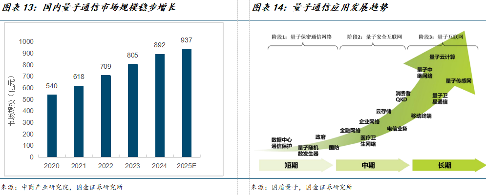 量子通信市场持续扩容,行业前景广阔。在国家战略驱动下,量子通信作为前沿科技领域的重要方向,正持续获得资本市场和产业界的高度关注。根据中商产业研究院数据显示,中国量子通信市场规模由2020年的540亿元增至2024年的892亿元,年均复合增长率(CAGR)达13.4%,呈现稳健增长态势,预计2025年市场规模有望达937亿元,行业增长潜力或将持续释放。