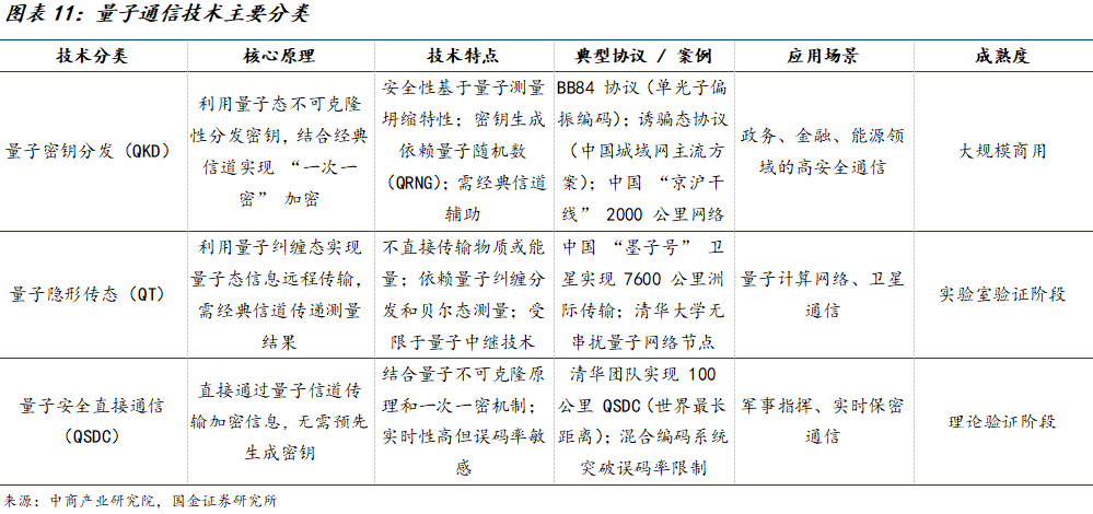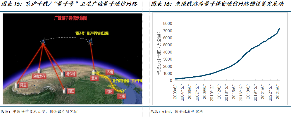 国内量子通信技术已具备商用条件,量子安全组网加速建设。在政策引导与重点行业需求的双重驱动下,中国已构建起全球领先的量子通信网络体系。近年来,中国加速推进量子通信领域产业化,以“京沪干线”和“武合干线”为代表的地面量子通信骨干网络,与“墨子号”量子科学实验卫星相结合,构建了天地一体化的量子通信网络。目前,中国已部署的量子保密通信光缆总长度突破1.2万公里,覆盖粤港澳、京津冀、长三角、成渝等重点区域。随着量子中继关键技术突破、量子微纳卫星与小型化地面站实用化,中国量子通信网络建设有望进一步提速。