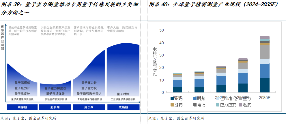 量子精密测量各细分领域呈现差异化发展态势,重力测量市场潜力最大。量子精密测量领域包含多个细分方向,不同物理量的量子传感器在成熟度上存在差异,量子重力测量推动专用量子传感成长的主要细分方向,产业利润空间较大。在5G通信技术规模化部署和AI技术快速迭代的背景下,智能终端设备对高精度时间同步的需求呈现指数级增长,叠加军事信息化建设对纳秒级时间同步的刚性需求,共同推动量子时频需求持续增长。根据光子盒统计,2024年,量子时频市场份额约为6.4亿美元,占比最高(38.55%)。与此同时,量子重力仪在矿产、石油及地下结构探测中具备巨大应用潜力,预计2035年量子重力测量市场规模将达10.9亿美元,年复合增长17.21%。旋转测量、电场测量、温度测量和压力测量等细分领域的产业规模则相对较小,更多是基于特定工业和科研需求的驱动。