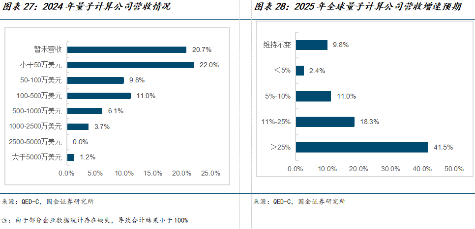 预计2025年约六成量子计算企业营收将显著提升。根据QED-C统计,全球513家量子计算企业中,2024年营收突破1000万美元的企业占4.9%,而收入不足50万美元的企业比例高达42.7%。反映出行业发展初期存在的显著分化现象。技术储备雄厚、资金实力突出且掌握市场渠道的企业竞争优势显著。随着量子硬件应用范围的持续扩展以及政府资金投入的逐步加大,预计2025年将有59.8%的量子计算公司实现10%以上的收入增长,行业有望快速构建起技术迭代与市场需求双向驱动的良好格局。